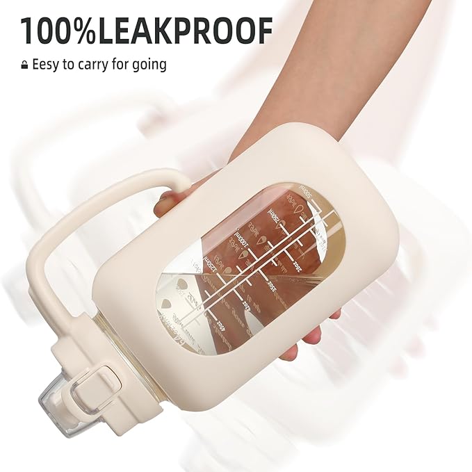64 oz Glass Water Bolttles Half Gallon Large Motivational Water Bottle with Time Marker Sports Water Bottles with Silicone Sleeve and Handle Lid Water Jug for Gym Workout-1 Pack