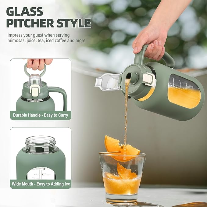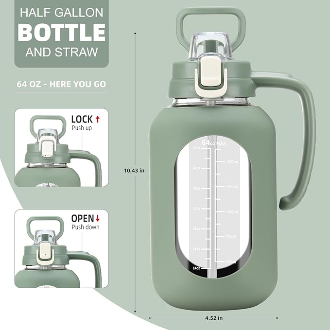 • 【Glass Water Bottle with Silicone Sleeve】Olivego big water bottle for easy to carry and use. The half gallon water bottle with straw has an anti-slip and high quality silicone sleeve to protect the glass water bottle and help prevent it from being slippery in your hands or slight bumps.The handle ensures a firm grip & our wide mouth flip cap spout makes pouring easy & smooth.