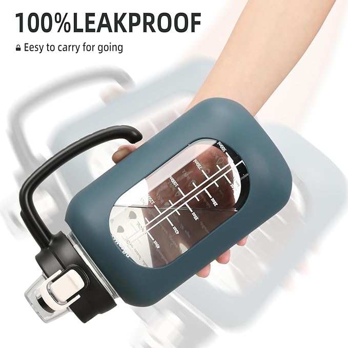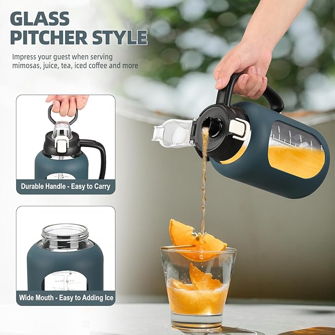 • 【Glass Water Bottle with Silicone Sleeve】Olivego big water bottle for easy to carry and use. The half gallon water bottle with straw has an anti-slip and high quality silicone sleeve to protect the glass water bottle and help prevent it from being slippery in your hands or slight bumps.The handle ensures a firm grip & our wide mouth flip cap spout makes pouring easy & smooth.
