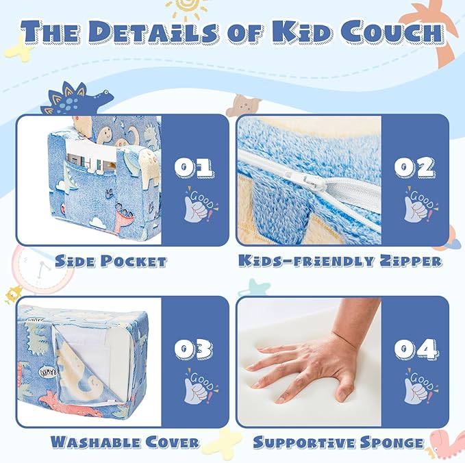 • THOUGHTFUL CUTE FEATURE:1.Product Weight only 5 LBS, kids can move it around easily; 2.Side pockets store books and toys within easy reach. 3.Ergonamic armrest and recline backrest help kids practice sitting for reading. 4.It came vacuum sealed and pre-assembled, with no chemical odor and just took a day to fluff up. It is very suitable as a birthday gift, Christmas gift and baby shower gift.