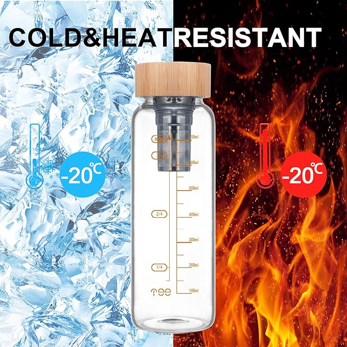• Durable: Made from premium borosilicate glass, this water bottle ensures durability and safety. Its leak-proof lid with silicone sealing ring prevents spills, providing peace of mind on the go. The wide mouth design makes cleaning easy, and the bottle is dishwasher safe, ensuring hassle-free maintenance.