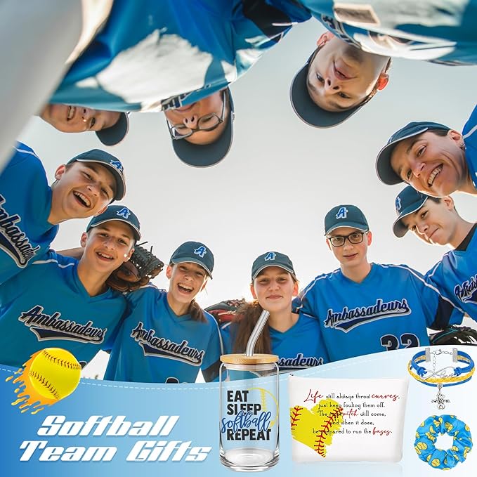 4 Pcs Softball Gifts Softball Glass Cup 16oz Softball Water Bottles Inspirational Softball Theme Makeup Bag Softball Bracelet Elastic Softball Scrunchies Softball Accessories for Girls Back to School
