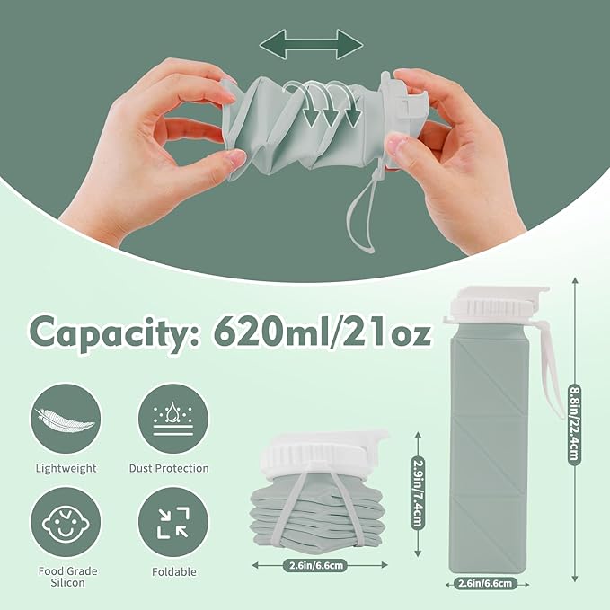 20 oz Water Bottle Collapsible | BPA Free Leakproof Lightweight Foldable Silicon Water Bottles | Twistable Water Cup | for Travel Gym Hiking Outdoor Camping Running Cycling Sports (Green)