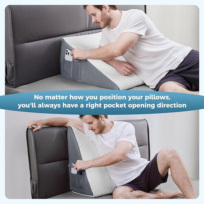 • 【Careful & User-Friendly Design】This wedge pillow includes a convenient carrying handle, 2 side pockets with different orientations, allowing you to store your phone, glasses, or remote control with ease. Additionally, its anti-slip bottom ensures that the pillow remains in place, so you no longer need to worry about it moving around