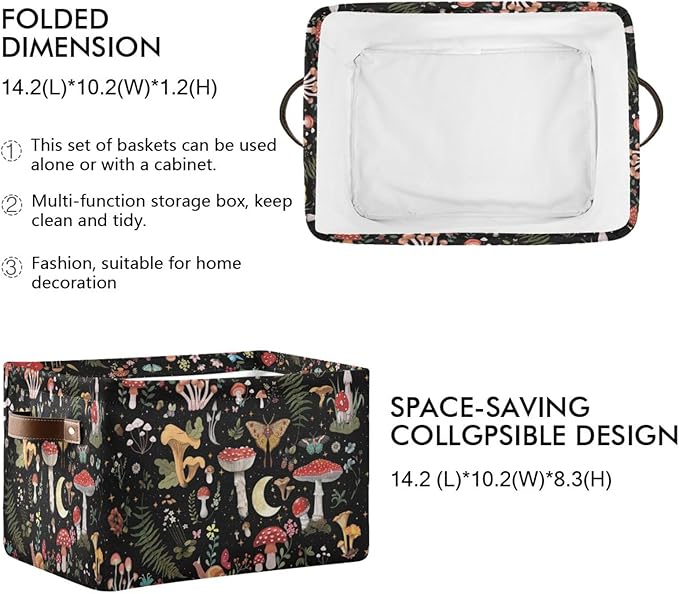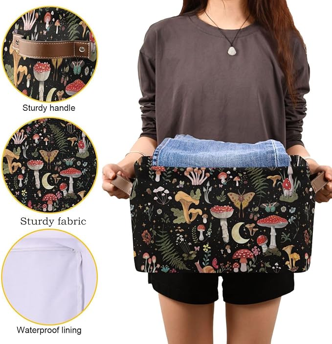 Mushroom Gothic Witch Storage Basket Bin for Shelves Closet Fern Leaves Foldable Fabric Storage Box Cube with Handles Kids Gifts Toy Clothes Shelf Basket Organizer for Bedroom Nursery Home Decorative