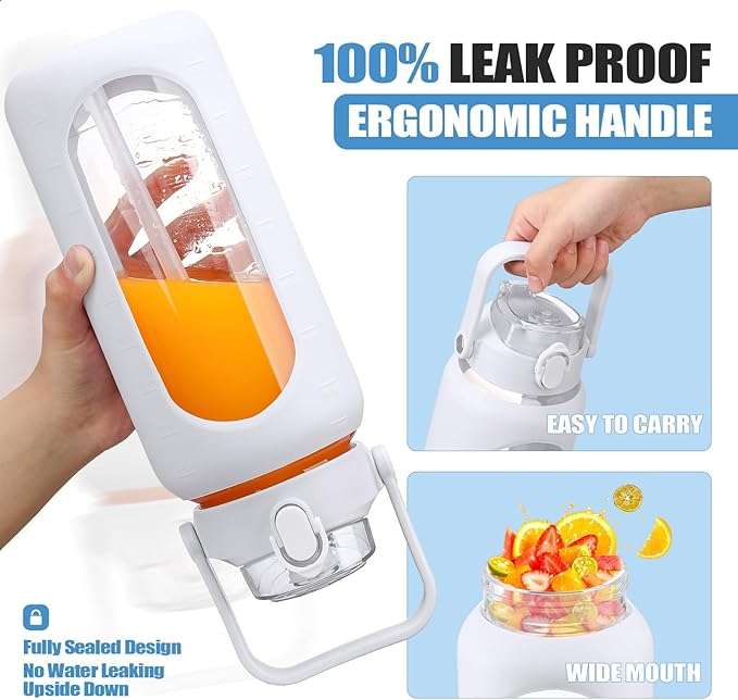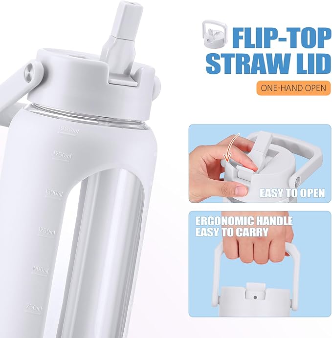 • MOTIVATIONAL TIME & VOLUME Marker: With inspirational TIME and VOLUME marker, the 64 oz glass water bottle can remind you of your goals of drinking all days.2 liters large capacity allow you not to refill it frequently any more. That is equivalent to 8 cups of water,suggested by scientists for human drink per day, helps you stay hydrated and daily healthy.
