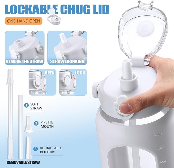BLUEGO 64oz Glass Water Bottles with 2 Lids Flip Lid and Spout Lid Half Gallon Water Bottle with Straw 2L Large Water Bottle with Time and Capacity Markers for Gym Home Office Leak-proof, White