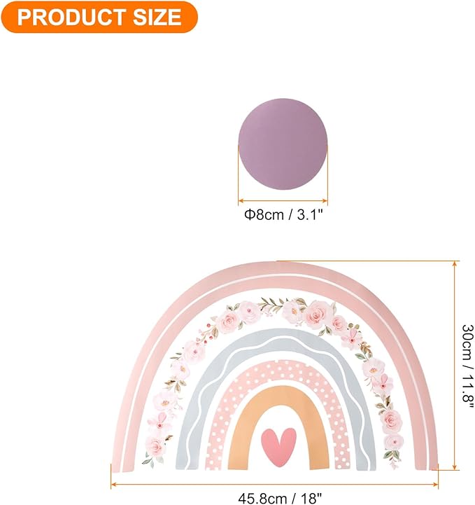 • Color: Multicolor; Material: PVC; Sticker Size: Rainbow: 45.8 x 30cm / 18 x 11.8inch(L x W), Small Dots: 3cm / 1.2inch, Medium Dots: 6.2cm / 2.4inch, Large Dots: 8cm / 3.1 inch; Packing Content: 1 Sheet x Wall Sticker ( include 18 Pcs)