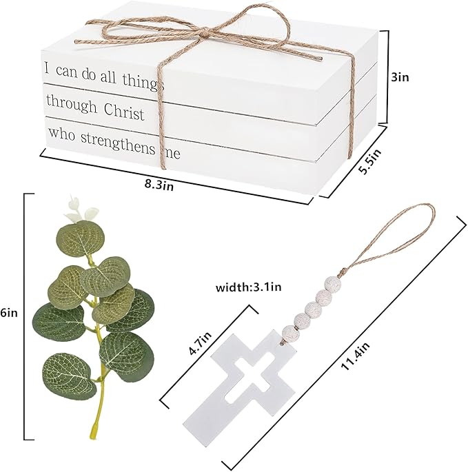 • PACKAGE: The package contains a set of wooden decorative books, wood bead garland with cross, and artificial eucalyptus leaves