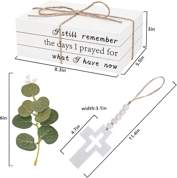 • PACKAGE: The package contains a set of wooden decorative books, wood bead garland with cross, and artificial eucalyptus leaves