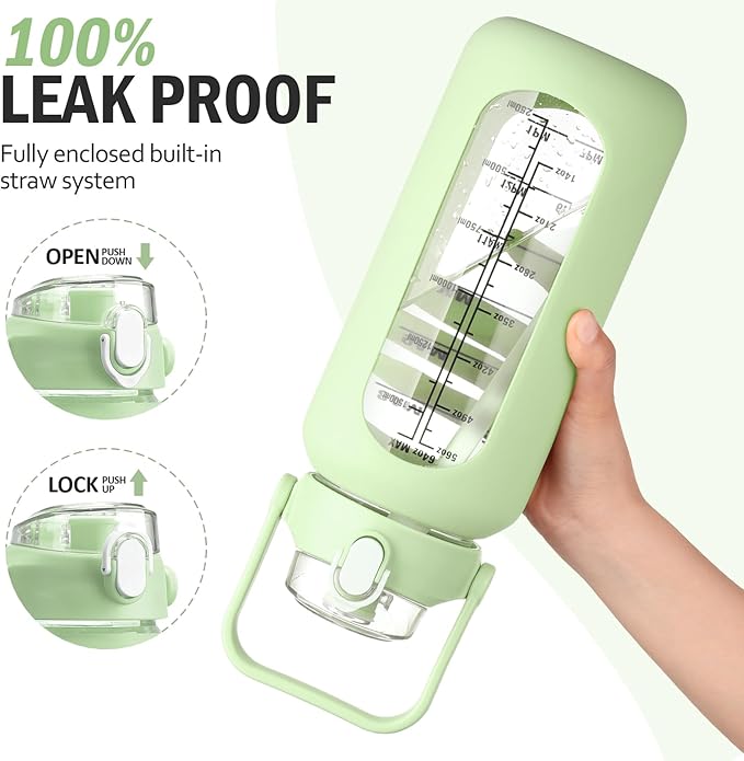 • TIME MARKERS - Our water bottle with time marker 64 oz features time reminders for effortless daily hydration tracking. The clear markings on the glass ensure easy readability and mastery of your water intake goals.