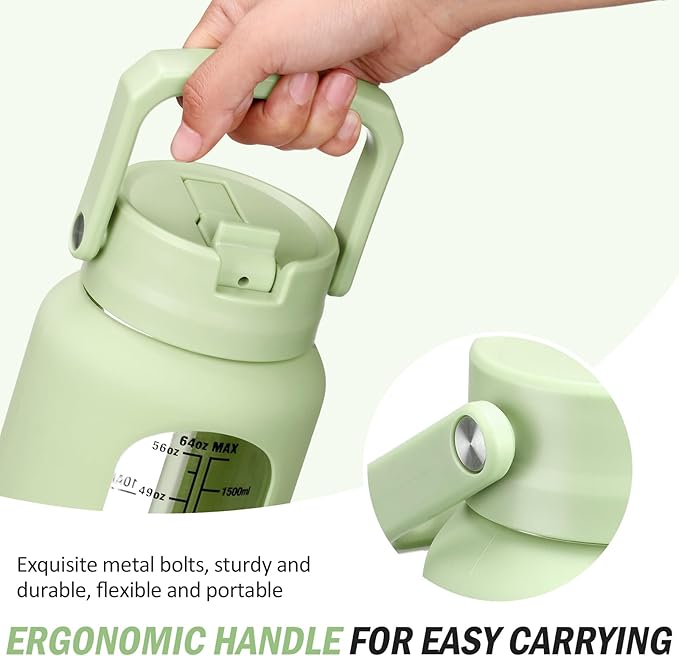 • ADVANCED HANDLE - NOLOGLAZIC half gallon water bottle features a lightweight yet durable plastic handle with a sturdy metal bolt connection, ensuring robust weight-bearing capabilities. The upgraded ergonomic design aligns with natural gripping habits, providing a comfortable hold with anti-slip and anti-sweat features. Say goodbye to ordinary handles and embrace a more powerful and thoughtful design, delivering outstanding quality and comfort to your hydration experience.