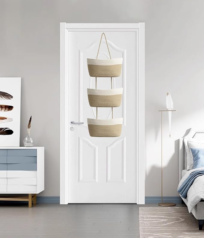 Hanging Baskets for Organizing,Bathroom Organizers and Storage,3-Tier Woven Cotton Wall-Mounted Storage Organizer Bag Decorative,Kitchen,Living Room,Bedroom,Nursery