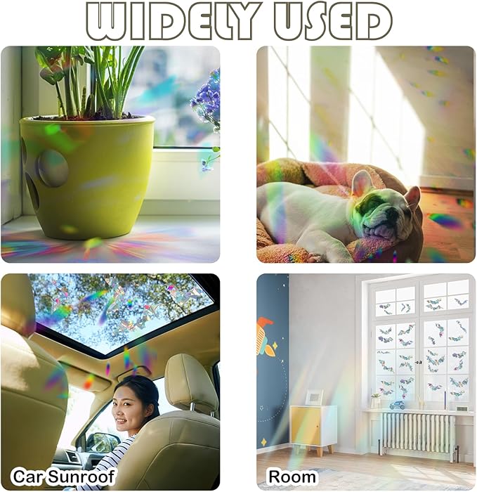 • 【Unique Design】Window decals to prevent bird strikes adopt a prism design, showing colorful colors and brightness under different light, which can please the body and mind add visual enjoyment. The design is simple and elegant, suitable for various occasions. Anti bird strike window decals are easy to disassemble and carry, making them suitable for frequent position changes.