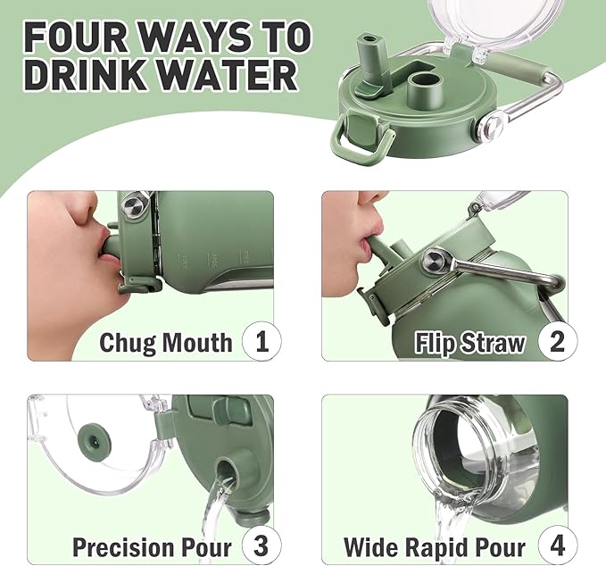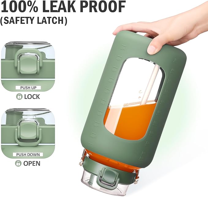 • INNOVATIVE DUAL-PURPOSE LID -The straw lid of 84oz glass water bottle offers two ways to drink. Whether you prefer sipping through a Flip Straw or chug from the Spout Mouth, the unique 2-In-1 Lid got you covered. The Leakproof lid also features a One-click Snap Lock and Dust-proof Cap for cleaner and more Hygienic drinking experience. One-handed operation-Push up to lock, Push down to unlock.