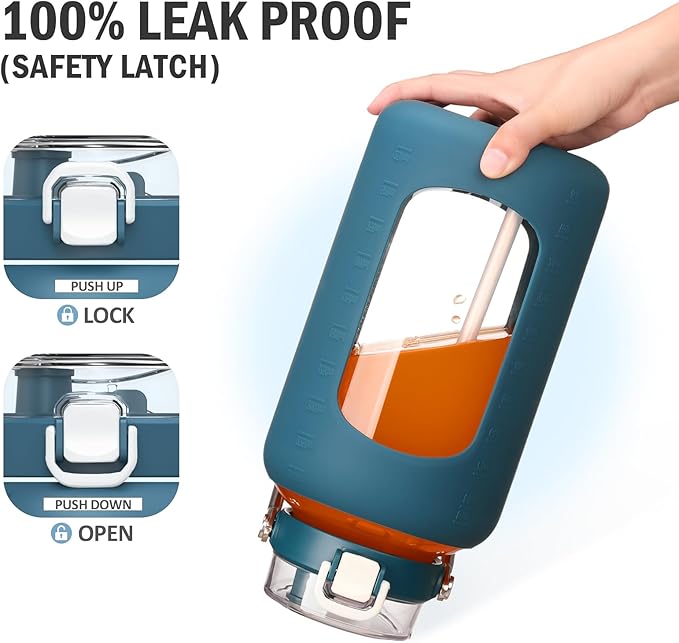 • INNOVATIVE DUAL-PURPOSE LID -The straw lid of 84oz glass water bottle offers two ways to drink. Whether you prefer sipping through a Flip Straw or chug from the Spout Mouth, the unique 2-In-1 Lid got you covered. The Leakproof lid also features a One-click Snap Lock and Dust-proof Cap for cleaner and more Hygienic drinking experience. One-handed operation-Push up to lock, Push down to unlock.
