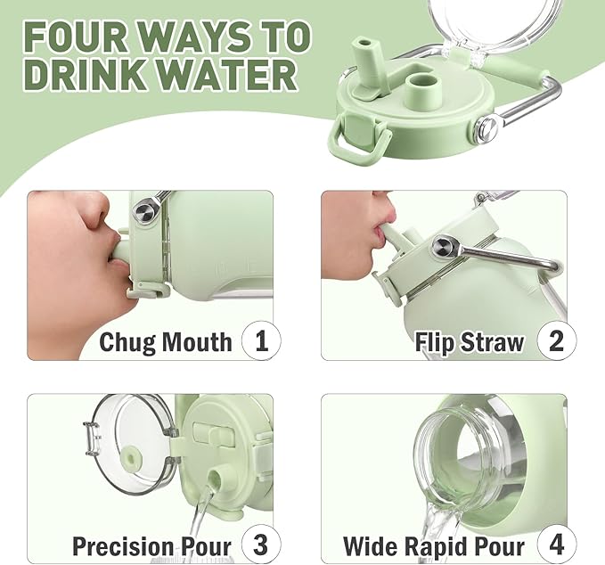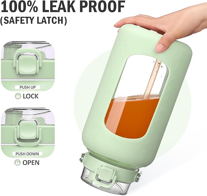 • INNOVATIVE DUAL-PURPOSE LID -The straw lid of 84oz glass water bottle offers two ways to drink. Whether you prefer sipping through a Flip Straw or chug from the Spout Mouth, the unique 2-In-1 Lid got you covered. The Leakproof lid also features a One-click Snap Lock and Dust-proof Cap for cleaner and more Hygienic drinking experience. One-handed operation-Push up to lock, Push down to unlock.