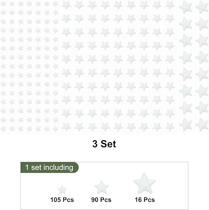 • 3 Set x glow in the dark stickers, 1 set including 16 pcs x 15mm Stars, 90 pcs x 10mm Stars,105 pcs x 5mm Stars,totally 211 pcs,3 Set in total 633 pcs; Color: Blue; Adhesive: self-adhesive; Style: Stars
