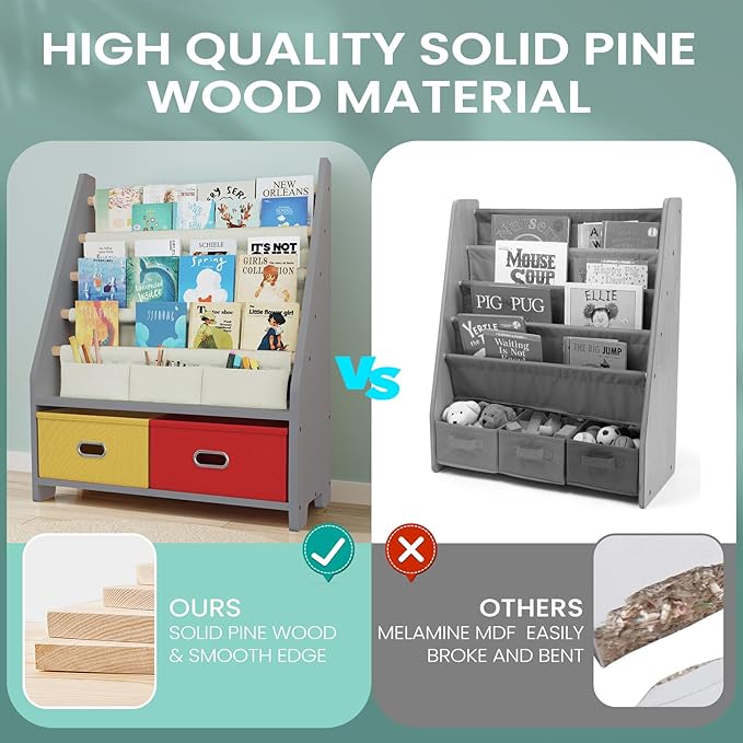 • NATURAL SOLID WOOD: Not like Melamine MDF as unpleasant smell, easily broke and bent, the broken residue will hurt children, this kids bookshelf is selected with high-quality natural solid pine wood which can completely eliminate these problems, it's durable and safe; paint-free design without any irritating and harmful odor.