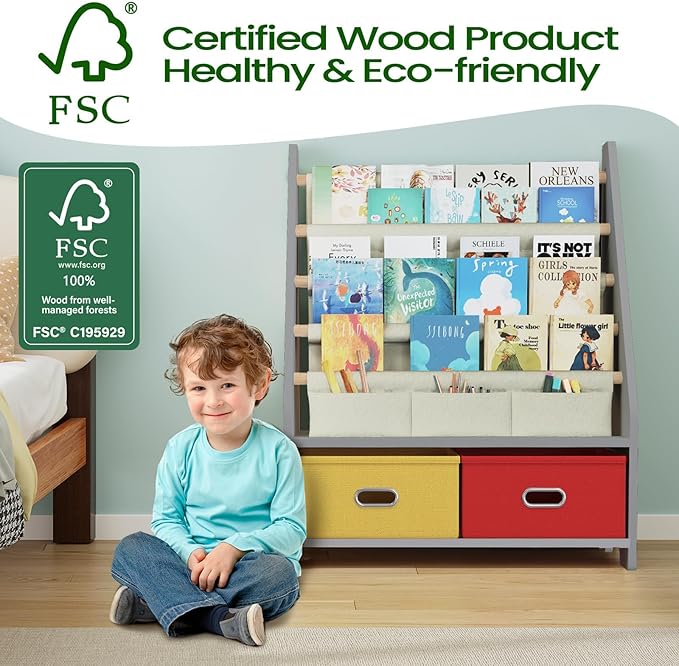 • CHILD-FRIENDLY DETAILING: All solid wood material of this kids book shelf is hand-made and polished, careful polishing of edges and corners, sleek edges and rounded corners minimize the risk of bumping or scratching. The sling bookshelf adopts stronger and wear-resistant cotton linen canvas for durable and attractive.A great toy and book organizer for kids, boys, girls, toddlers and children.