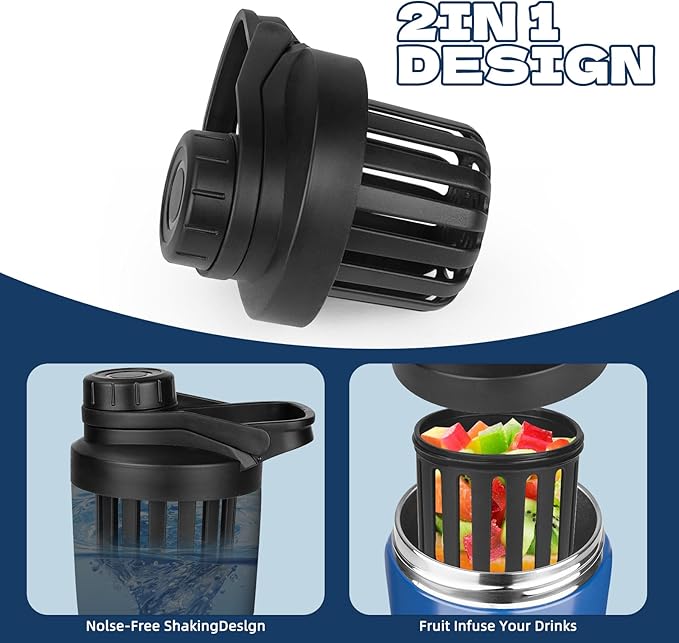 • [INNOVATIVE UPGRADED NOISE-FREE SHAKING DESIGN]:The UPGRADED noise-free shaking design, compared to the traditional old-fashioned shaker ball, our integrated removable agitator won't rattle and make a mess when you're mixing your supplements.You can also add small pieces of fruit to the adapter to create your favorite flavor.