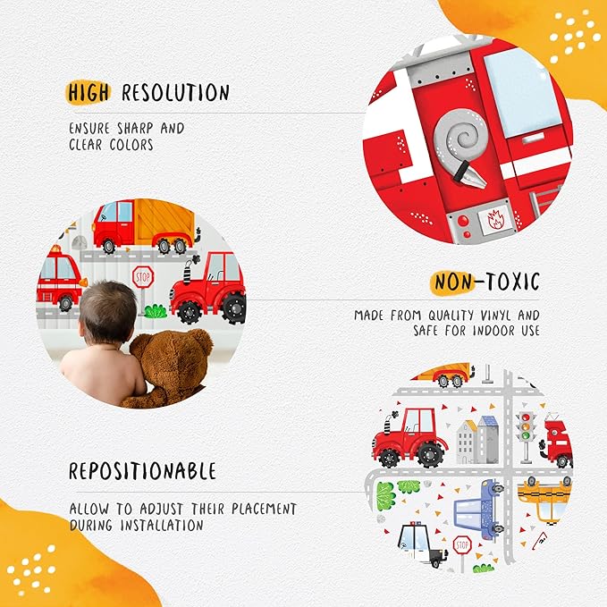 • 🦁 Nursery decor for kids rooms includes: car, police car, truck, excavator, fire truck, taxi, tractor, crane as well as houses, roads, signs and trees to instantly bring a boring wall to life. Item sizes range from 2" x 2" to 6.2" x 11", for a total of 58 items. Stickers come in an envelope in 5 sheets. Sheet size is 13.8" x 7.8".