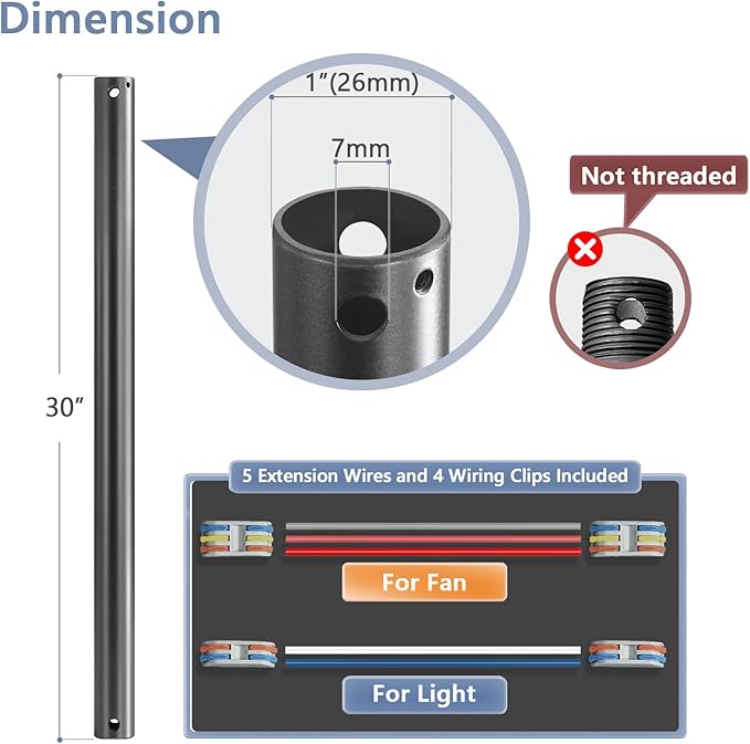 30" Ceiling Fan Downrod, 【1 Outside Diameter】 Black Extended Downrod, including 4 Wire Connectors and 5 Extension Wires (No Threads)