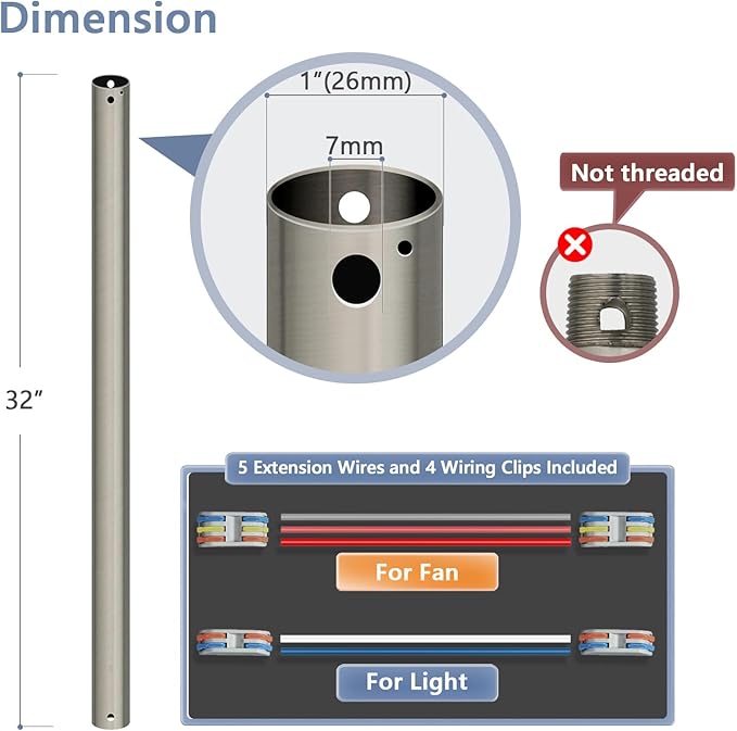 32" Ceiling Fan Downrod, 【1 Outside Diameter】 Brushed Nickel Extended Downrod, including 4 Wire Connectors and 5 Extension Wires (No Threads)