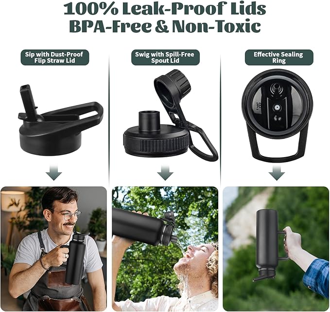 • šŸ’¦ć€2 Leak-Proof Lids怑Say goodbye to spills and leaks! This insulated water jug comes with 2 lids to meet your different drinking needs. The spill-free spout lid allows for one-handed opening and closing with a large drinking spout for quick sipping. The dust-proof flip straw lid makes sipping on-the-go easy and prevents ice from getting in. The lids feature a silicone ring to prevent splashing and dripping when overturned or shaken.
