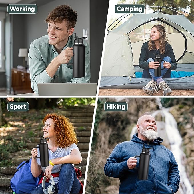 • šŸ’¦ć€Hot/Cold Insulated Water Bottle怑This 40 oz water bottle stainless steel features advanced vacuum insulation technology, keeping hot drinks hot for 8 hours and cold drinks cold for 12 hours. Enjoy a chilled beverage after intense exercise or a hot coffee during winter camping. The wide mouth design allows for easy cleaning and ice cube filling.