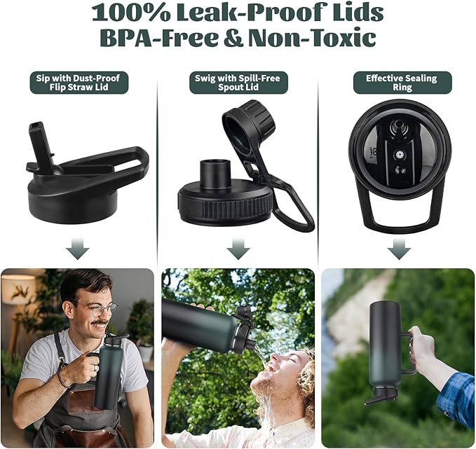 • šŸ’¦ć€2 Leak-Proof Lids怑Say goodbye to spills and leaks! This insulated water jug comes with 2 lids to meet your different drinking needs. The spill-free spout lid allows for one-handed opening and closing with a large drinking spout for quick sipping. The dust-proof flip straw lid makes sipping on-the-go easy and prevents ice from getting in. The lids feature a silicone ring to prevent splashing and dripping when overturned or shaken.