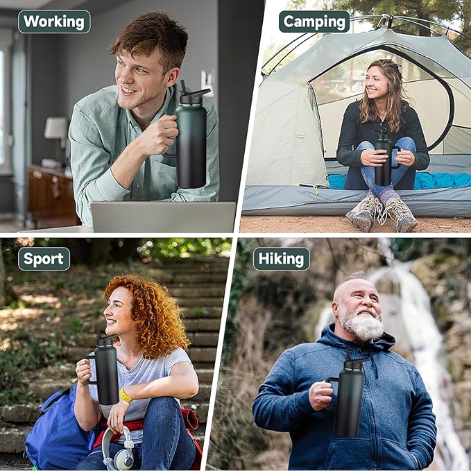 • šŸ’¦ć€Hot/Cold Insulated Water Bottle怑This 40 oz water bottle stainless steel features advanced vacuum insulation technology, keeping hot drinks hot for 8 hours and cold drinks cold for 12 hours. Enjoy a chilled beverage after intense exercise or a hot coffee during winter camping. The wide mouth design allows for easy cleaning and ice cube filling.