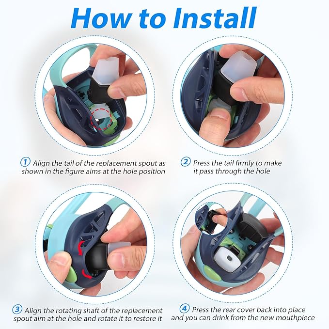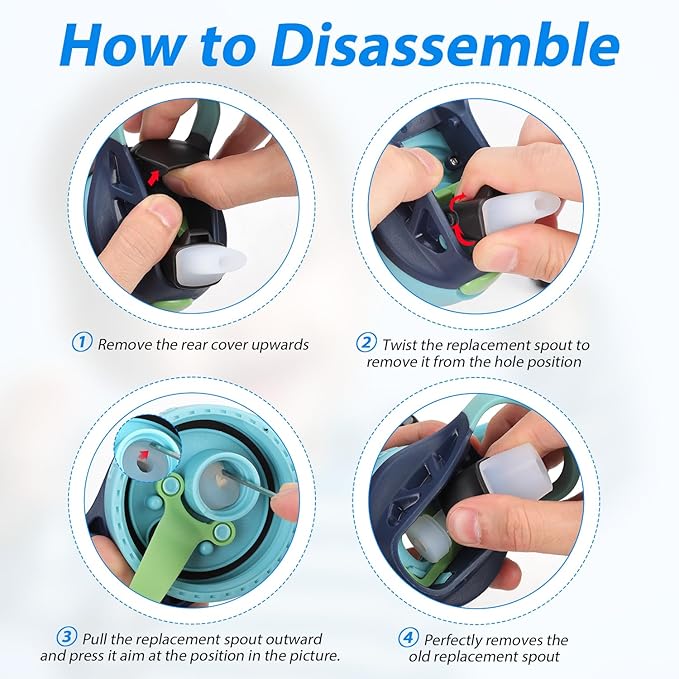 • How to Disassemble & Install: Turn the spout from the right; Take off the straw below; Take out the aid and take off the stuck silicone; The suction nozzle is successfully taken off. Aim the spout at the opening; Use the aid to press it; Gently twist the spout to fit the opening; Find the right angle and complete the spout installation.