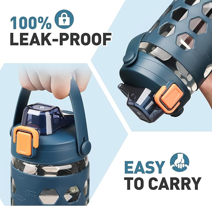 • SILICONE SLEEVES FOR BETTER GRIP:Use this water tumblers at home, office, take it to the gym or anywhere really! Our glass water bottles comes with a stylish silicone sleeve to offer you additional protection and to provide an extra grip to the bottle. The sleeve is removable, so you can use the water jug with or without it.