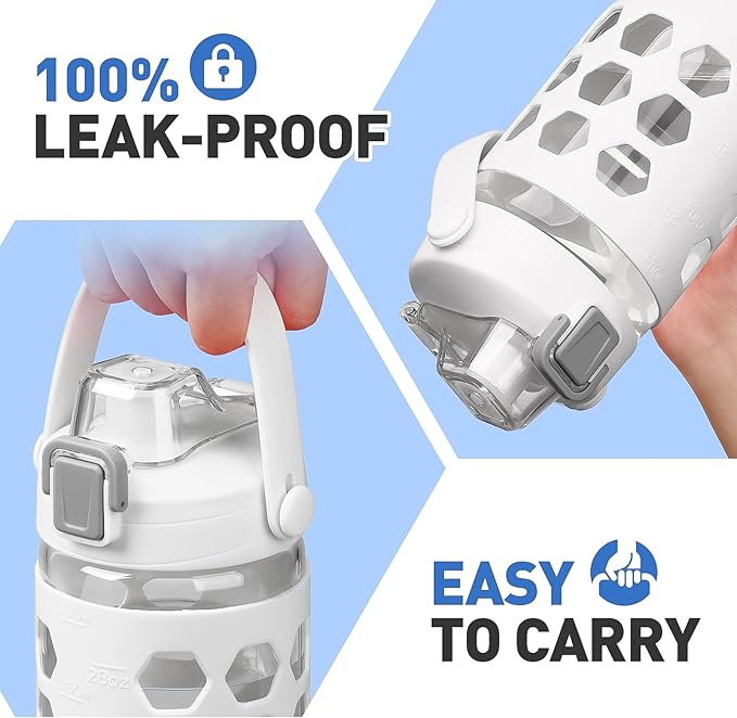 • GLASS WATER BOTTLES WITH TIME TO DRINK:MUKOKO 1 liter waterbottle with time marker preserves the purity of water. This is a very handy way to keep up with water intake,stay hydrated and healthy. It’s a great gift to have. They are great for home, work, and travel. The glass cup is a perfect gift for your family, friends, love ones, and also a perfect gift during ceremonies like Christmas or during mother’s, father’s day, or can offer as a birthday gift.