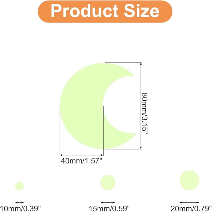 • [What You Get] - Moon Sticker Size: 80 x 40mm/3.15" x 1.57"(L*W); Dot Sticker Size: 20mm/15mm/10mm(0.79"/0.59"/0.39"); Package Content: 1 Set x Glow in The Dark Stickers