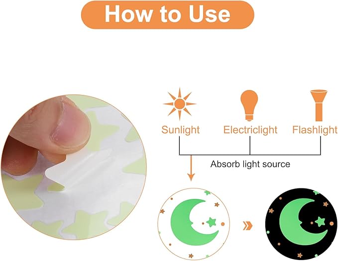 • [Easy to Use] - These self-adhesive decals can be easily pasted on clean and smooth ceilings and walls, just peel them off the paper and stick them on the wall, you can see the light emitted by these glowing stickers at night
