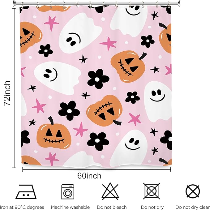 Halloween Pink Ghost Shower Curtain 60Wx72L Inch Pumpkin Cute Girls Horror Scary Spooky Cartoon Lovely Bathroom Set Accessories Decor with 12 Pack Hooks