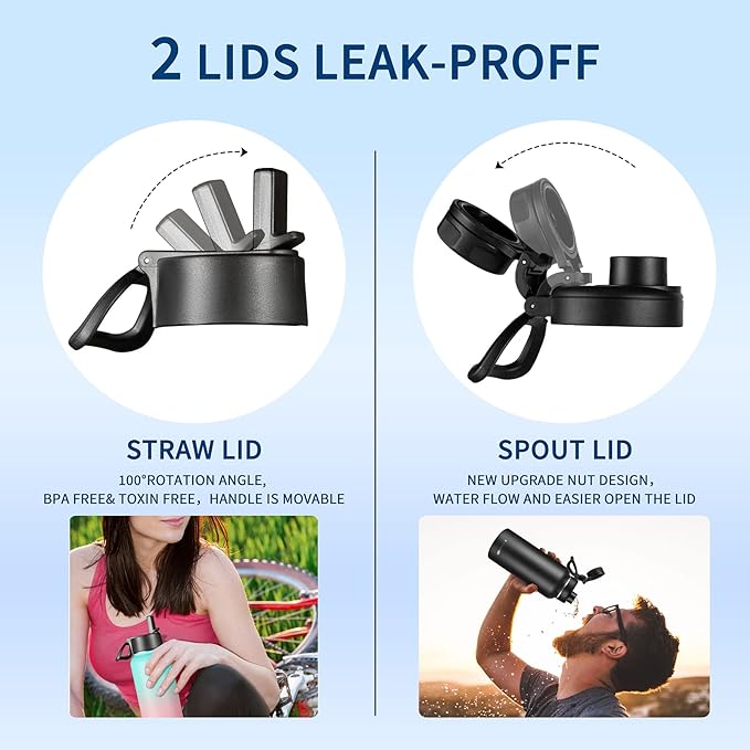 • 2 LEAKPROOF LIDS: Insulated water bottle with straw is equipped with 2 lids-Straw Lid& Spout Lid, both of which are sealed and leak-proof,Straw lid is right for cold beverages. Spout Lid is suitable for room temperature or hot drinks, It has two-stage force design to ensure that the lid won't fall off and knock your nose when you open it while drinking.