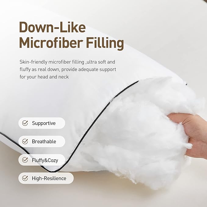 • Bed Pillows Set of 4: Each order will include 4 Hotel Quality Bed Pillows. These king size pillows for sleeping are made of soft, down-like polyester filling, which is extremely fluffy. The innovative high-end black piping design is simple, stylish, and full of elegance. They are excellent bedroom decorations and provide a 5-star hotel experience.