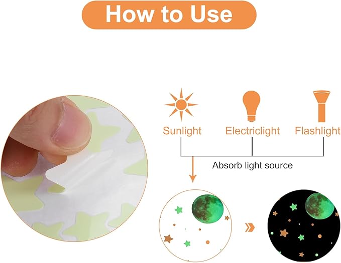 • [Easy to Use] - These self-adhesive decals can be easily pasted on clean and smooth ceilings and walls, just peel them off the paper and stick them on the wall, you can see the light emitted by these glowing stickers at night