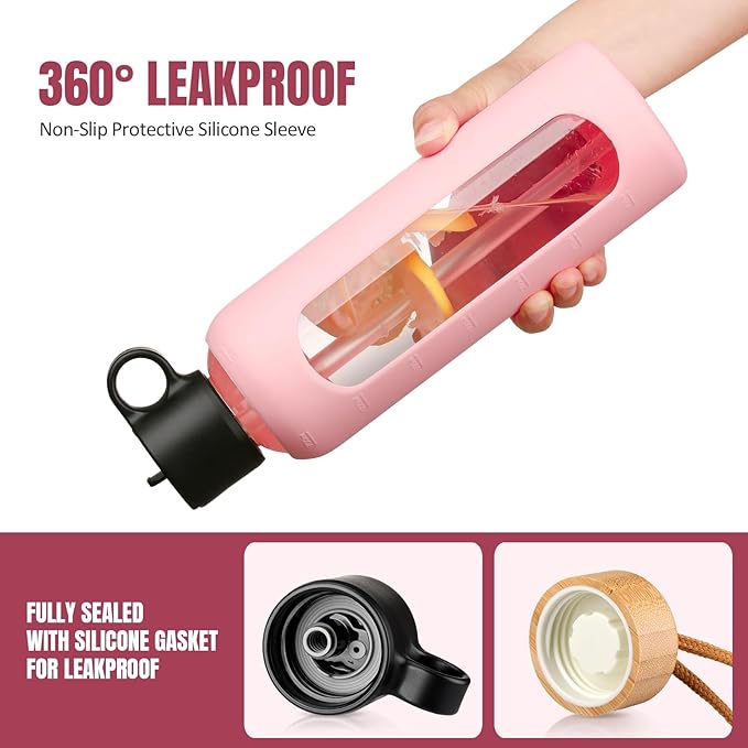 24oz Glass Water Bottle With 2 Lids-Flip Straw Lid, Bamboo Lid, Glass Water Bottle With Silicone Sleeve, Motivational Time Marker, Glass Juice Bottle for Cold Drink,Pink