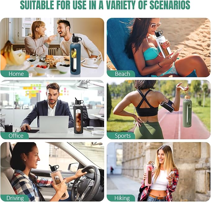 • MULTIPLE OCCASIONS -WINSA glass water bottle with straw is ideal for both daily inhouse or outdoor occasion, such as Home, work office, sports, gym, beach, hiking, camping or driving. Great present option for friends or families on School, Thanksgiving, Xmas, Birthday, Anniversary, etc. Our glass water bottle come with both 24oz and 32oz, each with 8 trendy colors and all have interchangeable 2 lids making this your ultimate drinking companion!