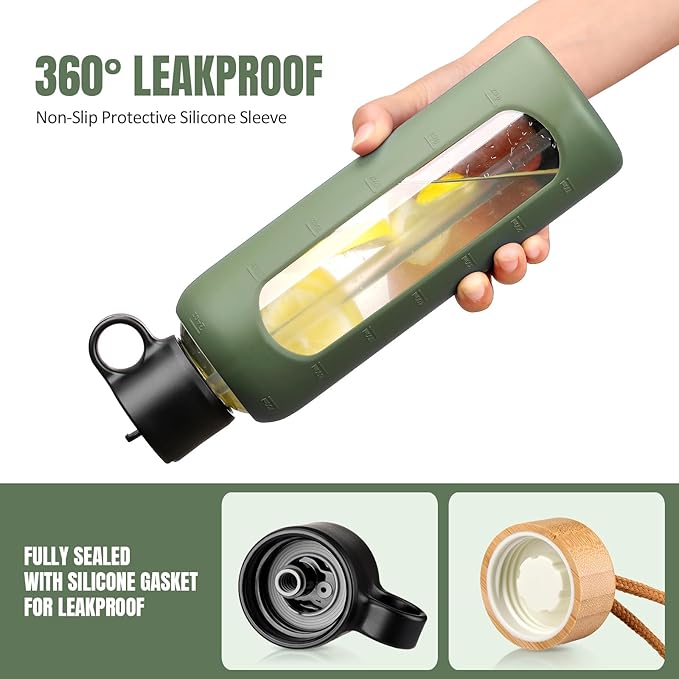 24oz Glass Water Bottle With 2 Lids-Flip Straw Lid, Bamboo Lid, Glass Water Bottle With Silicone Sleeve, Motivational Time Marker, Glass Juice Bottle for Cold Drink,Plive