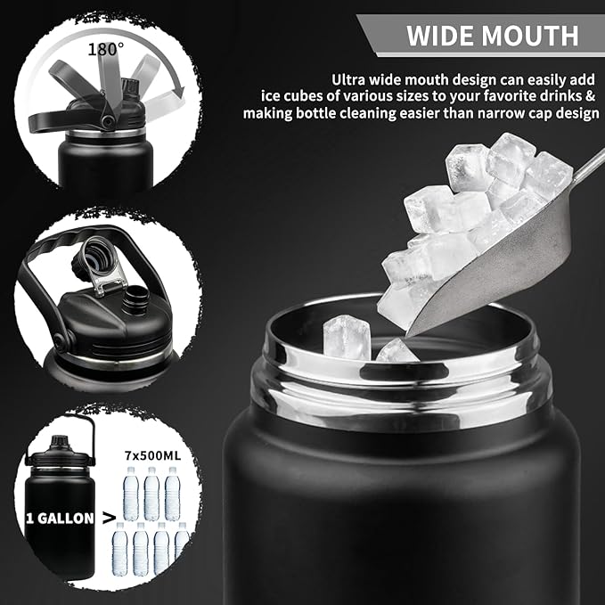 • 【Wide Mouth Water Bottle】: Our large water bottle features a ultra wide mouth design with a mouth diameter of 4.57 inches, allows ice cubes of all sizes to be easily added to your favorite beverage. And our wide mouth is easier to clean bottles than the narrow lid design.