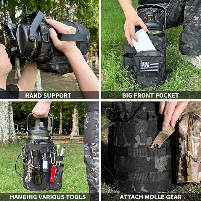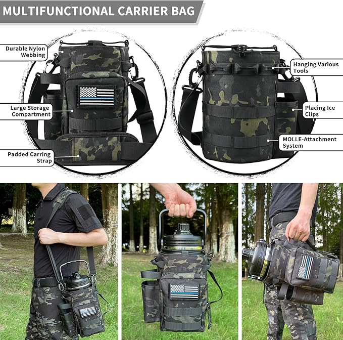 • 【Tactical Bag For Easy Carring】:Our water bottle holder is made of double-layer polyester and insulating Oxford cloth, which provides protection for the water jug. The water bottle bag also adds warmth, making it more effective in maintaining cold or hot. It has a detachable shoulder strap for carrying and a hand support strap on the side for easy pouring of water. Water bottle carrier bag has MOLLE webbing attachments and a large storage compartments for your phone, keys, wallet and more.