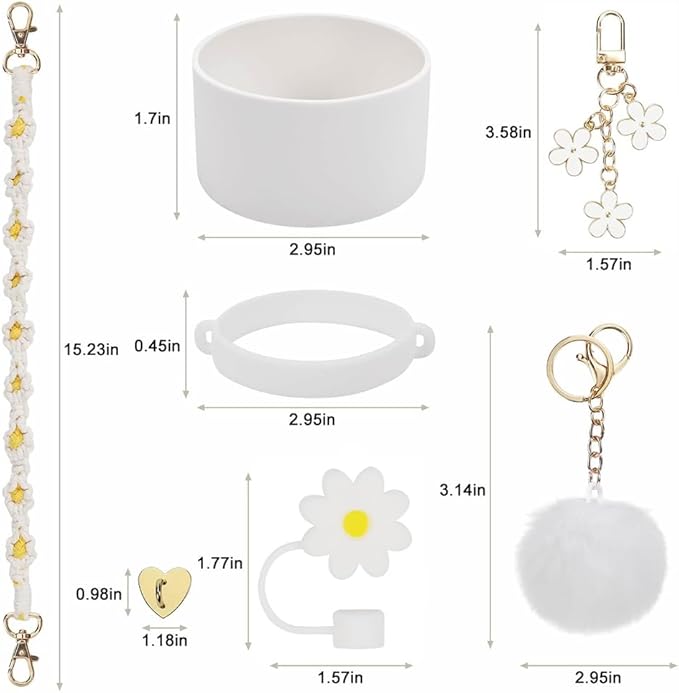7PCS Water Bottle Cup Accessories Set for Stanley Cup 40oz & 30oz Tumbler, Including Water Bottle Handle Strap, Silicone Cup Boot, Silicone Straw Cover, Keychain Charms(White)