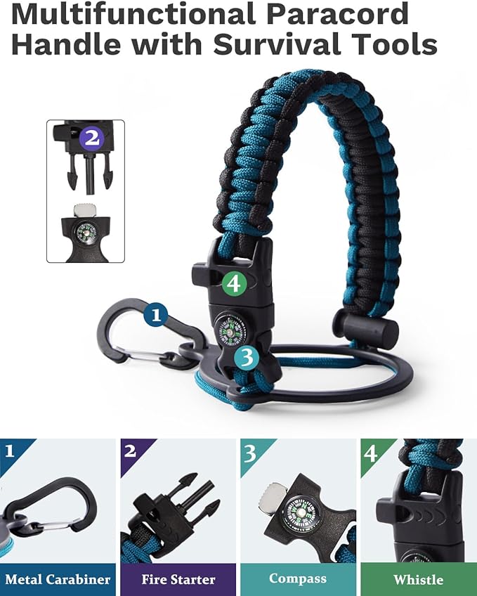 • READY FOR ADVENTURE:The nylon paracord on the bottle gives you more choices in terms of colour coordination and comfort on your hands compared to the handle lids.The paracord handle is made from sturdy braided rope with a survival kit attached. This includes a compass, safety loop, metal carabiner, flint, whistle and clip, making it the ideal companion for any outdoor activity.