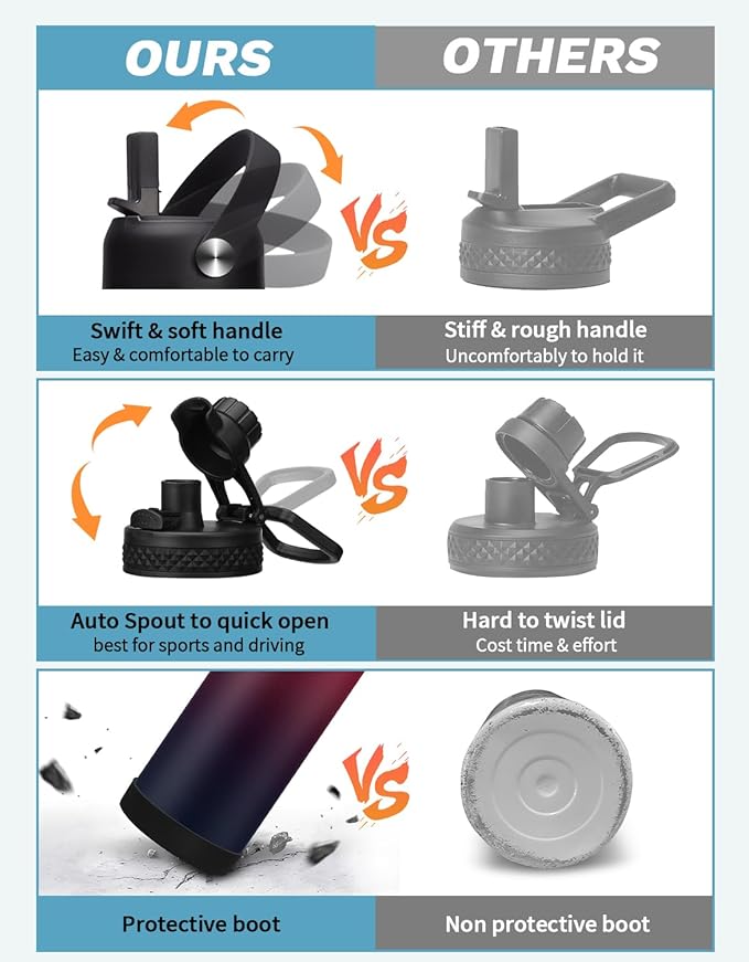 • DRINK WATER ON YOUR WAY: This stainless steel water bottle includes 2 leak-proof lids - 1 straw lid and 1 auto-spout lid - to meet your different drinking needs. The pop-up spout lid is designed for one-handed opening and closing, with a large water outlet for fast drinking. The spill-proof straw lid makes it easy to sip on the go, great for all your outdoor adventures, and also prevents you from inhaling ice cubes.Both are fitted with silicone rings to prevent any spills or leaks.