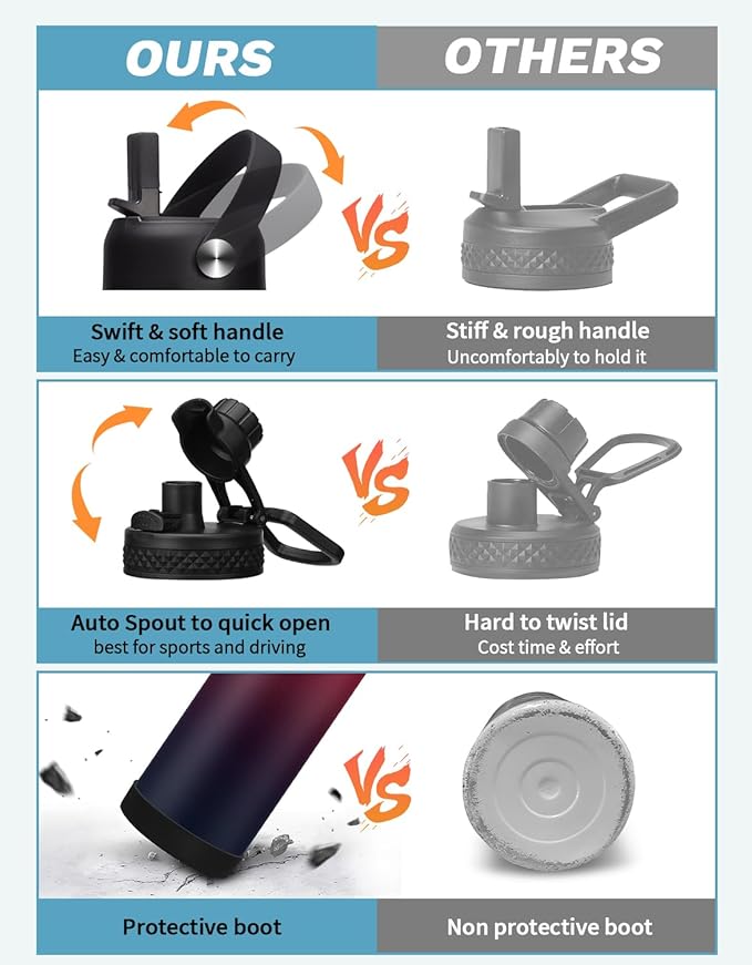 • DRINK WATER ON YOUR WAY: This stainless steel water bottle includes 2 leak-proof lids - 1 straw lid and 1 auto-spout lid - to meet your different drinking needs. The pop-up spout lid is designed for one-handed opening and closing, with a large water outlet for fast drinking. The spill-proof straw lid makes it easy to sip on the go, great for all your outdoor adventures, and also prevents you from inhaling ice cubes.Both are fitted with silicone rings to prevent any spills or leaks.